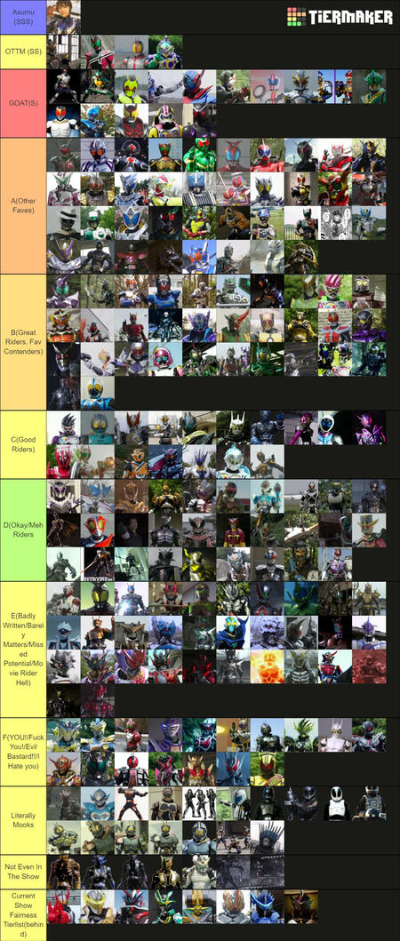 Extra media not on there: Homestuck, Kamen Rider, Super Sentai. Below is a topster of my top kamen rider seaons that I've seen. followed by my rider tierlist (out of date but i changed pcs so i'd have to make the whole thing again)